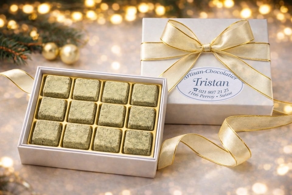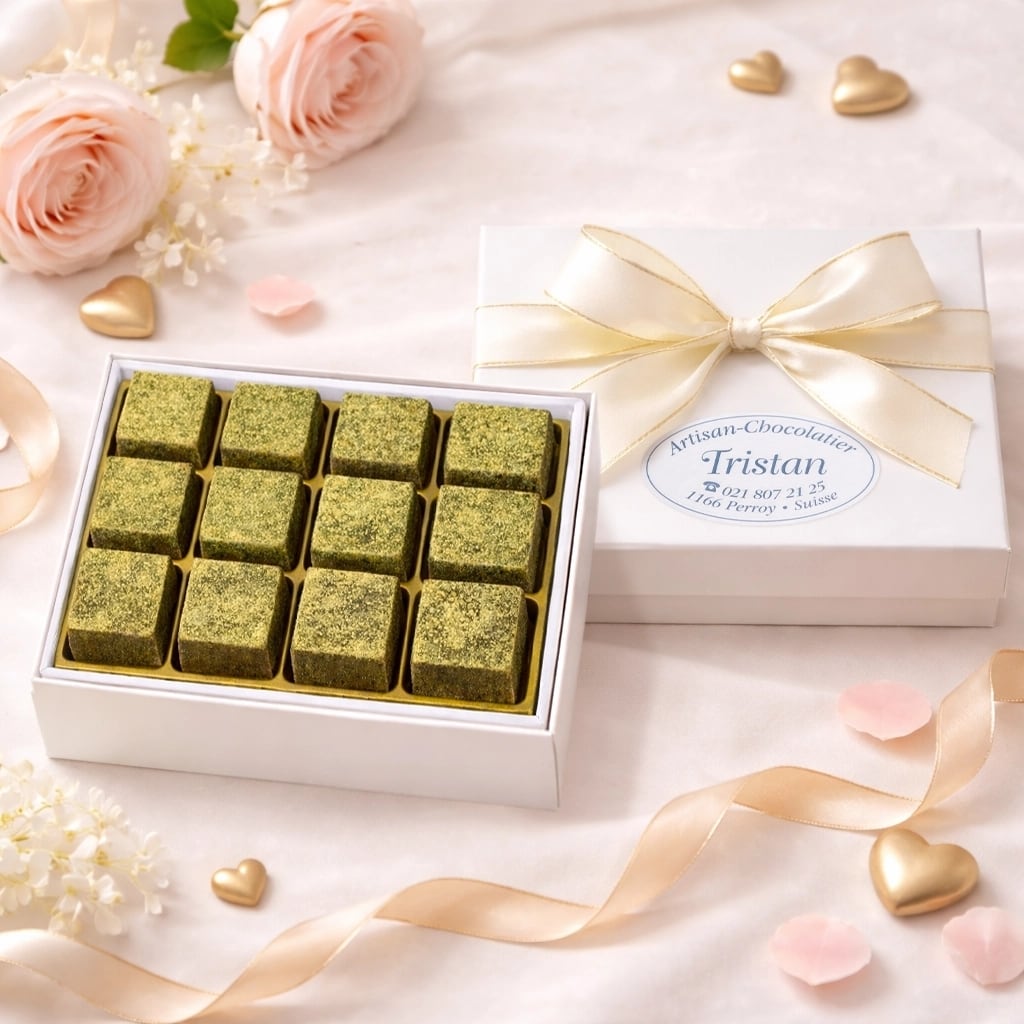 パヴェ・玄米茶:玄米茶の豊かな旨みとすっきりした後味が、チョコレートの繊細な甘さと完璧に調和。